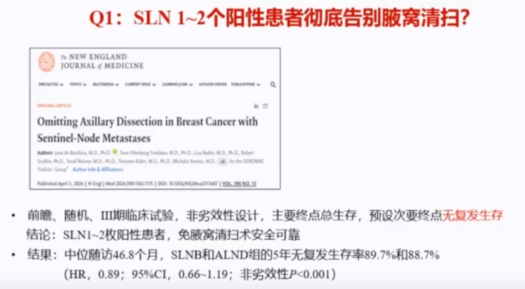 第一个话题:目前看来,前哨淋巴结1~2枚转移的患者,有望彻底豁免腋窝淋巴结清扫。既往对于这些患者,我们关注更多的是保乳手术。今年4月份在NEJM杂志发表的SENOMAC研究[1]入组了更高比例的接受乳房全切手术的患者,因此,豁免腋窝淋巴结清扫有望在原有的保乳手术患者的基础上,扩展到接受乳房全切手术的患者群体当中。