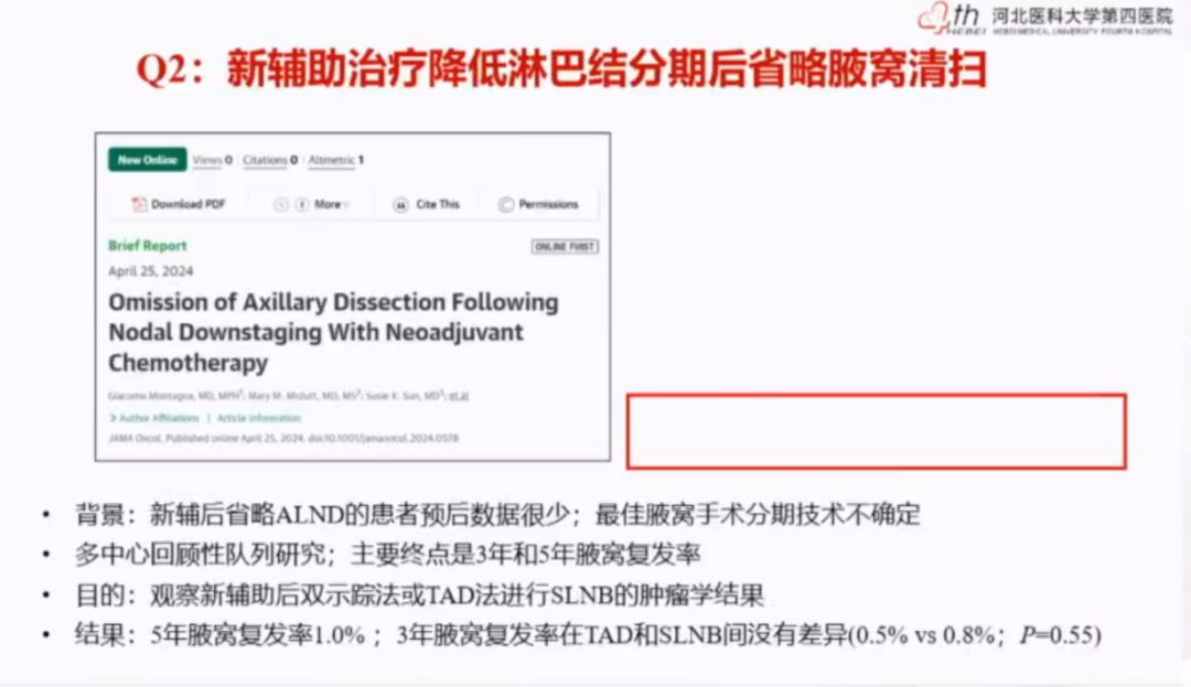 2、Montagna,Giacomo et al.“Omission of Axillary Dissection Following Nodal Downstaging With Neoadjuvant Chemotherapy.”JAMA oncology vol.10,6(2024):793-798.doi:10.1001/jamaoncol.2024.0578