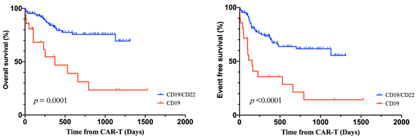 CAR-T细胞治疗时的中位年龄为4.2岁(范围:1-14.7岁),其中67.7%为男性。可测量残留疾病(MRD)阴性的完全缓解率(CR)在CD19 CAR-T细胞组为70.0%,在CD19/CD22 CAR-T细胞组为94.9%。与CD19 CAR-T细胞组相比,CD19/CD22 CAR-T细胞组的完全缓解率显著更高(P<0.05)。最常见的不良事件包括细胞因子释放综合征(89.9%),其中36.4%为3级或更高级别。2年总生存率(OS)估计为67.8%,无事件生存率(EFS)为54.2%。与CD19 CAR-T细胞组相比,CD19/CD22 CAR-T细胞组的OS和EFS显著更高(P<0.05)。观察到CAR-T细胞治疗后桥接移植的患者EFS有所提高。CD19/CD22 CAR-T细胞组未桥接移植的多变量分析显示,CAR-T细胞回输后第7天的MRD阳性是OS的独立不良预后因素(风险比<hr/>:6.300,P=0.022)。此外,CAR-T细胞回输后1个月时较高的CD4计数与更好的EFS独立相关(HR:0.165,P=0.021)。
