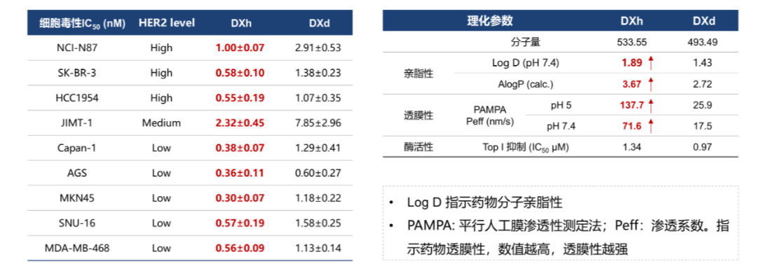 首先,毒素方面创新性地使用了更强载荷瑞泽替康,作为新一代拓扑异构酶I抑制剂,其细胞毒性IC50值更低,脂溶性与透膜性相较于DXd更强,潜在的旁观者杀伤效应更强。