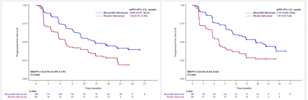在《Nature Communications》公布数据为该研究的期中分析结果。中位随访时间为8.7个月,研究结果显示达到了主要终点,吡洛西利+氟维司群组的PFS相较于氟维司群组延长近一倍,疾病进展或死亡风险显著降低44%(研究者评估:12.94 vs 7.29个月;HR 0.56,95%CI:0.39–0.80;P=0.001)。4月28日AACR大会壁报展示的最终分析结果比期中分析时随访延长了近11个月[13],中位随访时间为18.99个月,研究者评估的吡洛西利组的中位无进展生存期(mPFS)达14.69个月(95%CI:11.07-20.21),对照组为7.33个月(95%CI:5.49-11.04),(HR 0.542,95%CI:0.399-0.735,P<0.0001)。