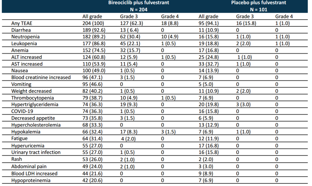 安全性方面,在数据截止时,吡洛西利的中位暴露持续时间为360天,安慰剂的中位暴露持续时间为223天。吡洛西利的中位相对剂量强度为90.55%,安慰剂为98.80%。在吡洛西利组中,最常见的治疗期间不良事件(TEAE)为腹泻、中性粒细胞计数降低、白细胞计数降低和贫血。大多数AE的严重程度为1级或2级,可通过对症治疗、暂停用药或下调剂量好转或痊愈。共有86名患者(42.2%)由于发生TEAE导致吡洛西利减量,8例患者(3.9%)因AE永久停用吡洛西利。