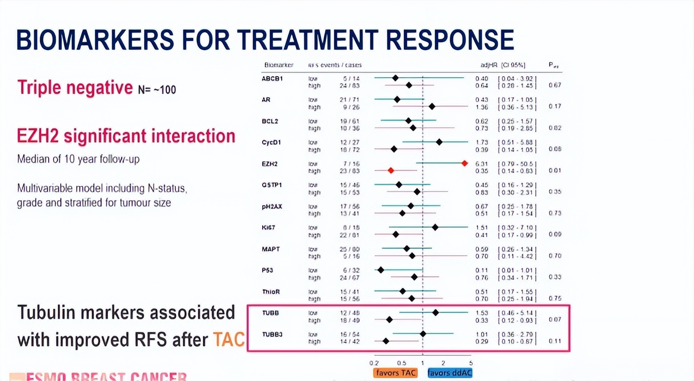 研究结论:三阴性乳腺癌患者中,EZH2低表达者更可能从ddAC方案获益,而EZH2高表达者接受TAC方案预后更佳。校正sTILs后,高微管蛋白表达可能提示多西他赛治疗获益。需开展更大样本量的研究以明确这些生物标志物的临床应用价值。
