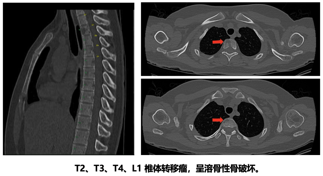 3、T2、T3、T4椎体多发转移瘤,同前相仿。