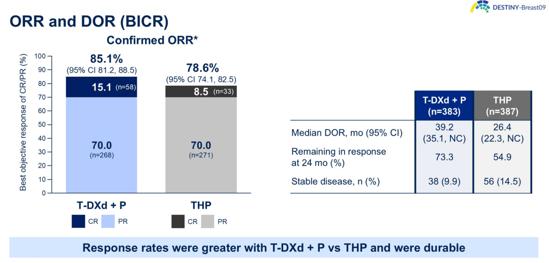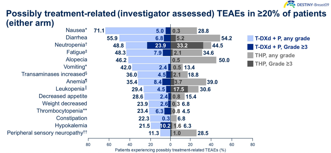 从近期疗效来看,T-DXd+P具有强效持久的肿瘤缓解效果。T-DXd+P组的ORR高达85.1%,高于THP组的78.6%;其中T-DXd+P组的完全缓解(CR)率相较于THP组提高了1倍(15.1%vs 8.5%);两组的中位持续缓解时间(DoR)分别为39.2个月和26.4个月。这些数据再次证实了T-DXd具有强大的肿瘤退缩作用,优化传统化疗方案。尤其对于需要快速控制肿瘤的高瘤负荷患者而言,T-DXd能够起到“立竿见影”的效果,大大增强医生和患者的治疗信心。