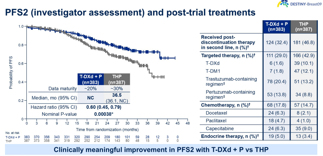 OS尚未成熟(成熟度16%),目前已显示有一定的获益趋势(HR 0.84)。在后线抗HER2治疗非常丰富的情况下,OS阳性结果难度较大,目前多数此类研究中OS并非主要终点。但从此次报道的PFS2结果来看,T-DXd+P组和THP组分别为未达到和36.5个月,风险显著降低40%(HR 0.60,95%CI:0.45~0.79,P=0.00038)。