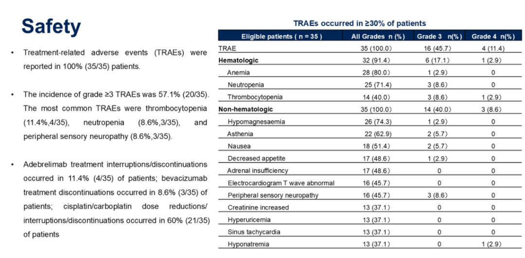 11.4%(4/35)的患者发生了Adebrelimab导致的治疗中断/终止;8.6%(3/35)的患者发生了贝伐珠单抗导致的治疗终止;60%(21/35)的患者进行了顺铂/卡铂的剂量减少/治疗中断/终止。