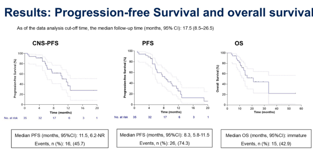 至数据分析截止时间,中位随访时间为17.5(95%CI:8.5-26.5)个月。中位PFS为8.3个月(95%CI:5.8-11.5个月),而中位中枢神经系统无进展生存期(CNS-PFS)为11.5个月(95%CI:6.2-NR个月),中位OS未成熟。