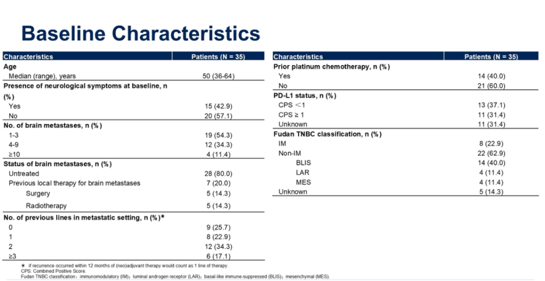 本分析的数据截止日期为2025年4月10日。从2020年8月至2024年10月,共纳入35名符合条件的患者。在所有患者中,42.9%(15/35)在基线时存在神经系统症状,80%(28/35)的患者未接受过针对脑转移的局部治疗。转移性疾病的中位既往治疗线数为2(范围0-4),40%(14/35)的患者既往接受过铂类药物。