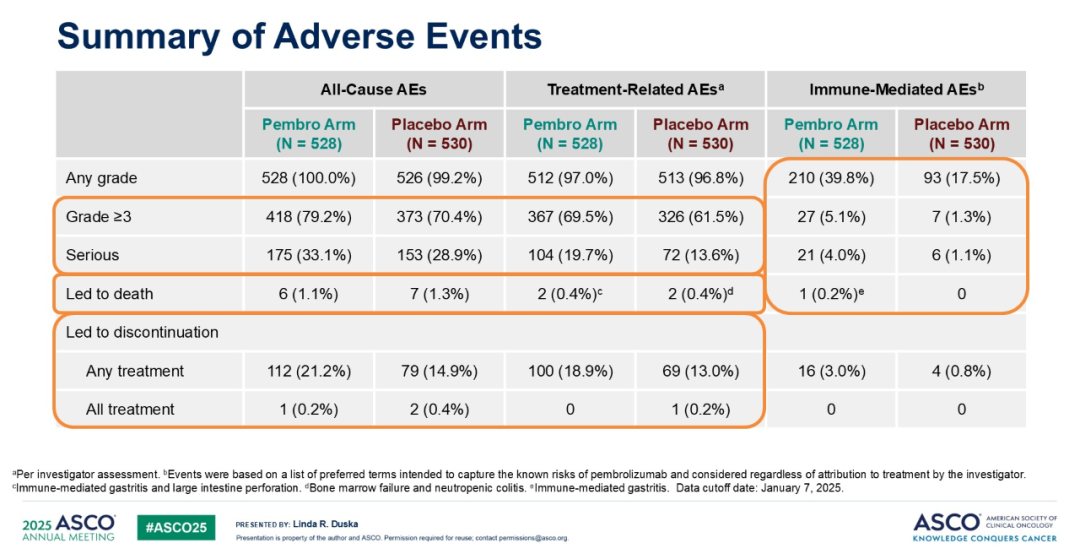 ☆帕博利珠单抗联合CCRT的安全性可控,并且与各药物的已知安全性一致。在更长时间的随访中未观察到新的安全性信号。帕博利珠单抗组和安慰剂组分别有97.0%和96.8%的患者出现治疗相关不良反应(TRAE),其中≥3级TRAE发生率分别为69.5%和61.5%,严重TRAE发生率分别为19.7%和13.6%。TRAE导致停止治疗的患者分别有18.9%和13.0%,且两组各有2名患者死亡。