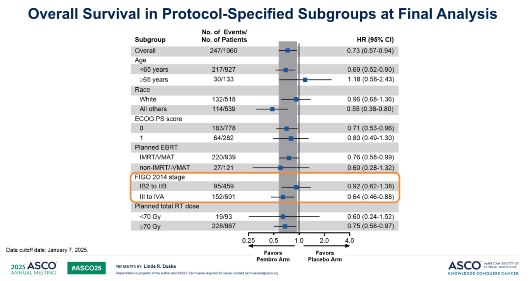 2025 ASCO发布的KEYNOTE-A18研究(NCT04221945)最终分析证实,在CCRT基础上联合使用帕博利珠单抗,并随后进行帕博利珠单抗维持治疗,可显著改善新诊断的高危局部晚期宫颈癌患者的生存结局。中位随访时间41.9个月,与单纯CCRT相比,帕博利珠单抗方案使疾病进展或死亡风险降低28%(PFS HR=0.72),死亡风险降低27%(OS HR=0.73)。OS获益在大多数亚组中均一致,且其可控的安全性与各个治疗方案的已知效果相一致。这些令人信服的结果确立了帕博利珠单抗联合CCRT成为该类患者群体的新标准治疗方案。