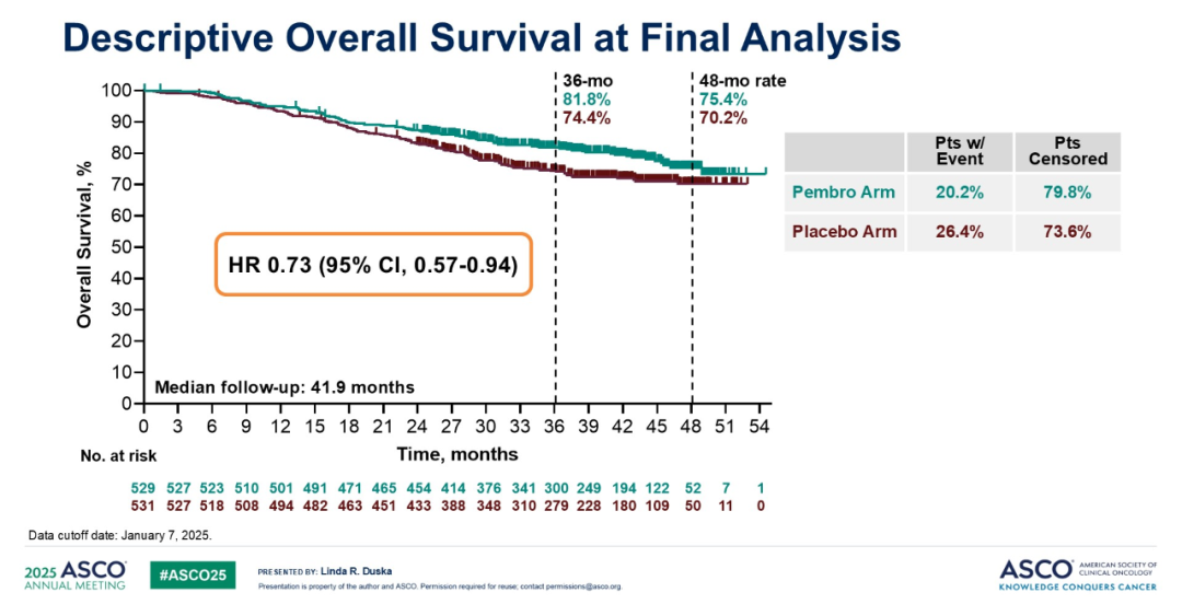 ☆最终分析的数据在2025 ASCO会议上分享,其数据截止日期为2025年1月。中位随访时间为41.9个月,PFS风险比为0.72(95%CI:0.59-0.87)。实验组和对照组的24个月PFS率分别为70.6%和59.7%,36个月PFS率分别为64.3%和55.6%。OS风险比为0.73(95%CI:0.57-0.94)。帕博利珠单抗组的36个月OS率为81.8%,安慰剂组为74.4%;48个月OS率分别为75.4%和70.2%。这些数据与之前的中期分析结果一致,并进一步支持将帕博利珠单抗联合CCRT作为该人群的新标准治疗方案。