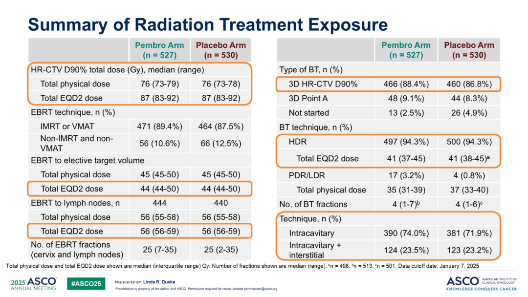 这种新的标准治疗方案对高危局部晚期宫颈癌患者群体具有变革性意义,但必须承认放射治疗在治疗该疾病方面始终具有重要作用。该研究提供了高质量的放射治疗,采用包括近距离放射治疗在内的最先进技术,主要以高剂量率进行。尽管受到疫情影响,75%的患者在56天内完成了放射治疗,放疗期间顺铂治疗的中位数为5个周期,符合治疗标准。高质量的放化疗对于新诊断高危局部晚期宫颈癌的治疗至关重要,为了真正优化患者的治疗疗效,高质量的放化疗必须与免疫疗法无缝衔接。
