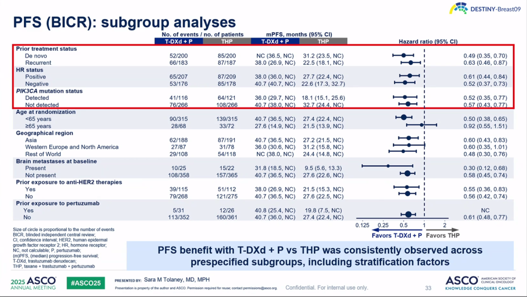 刘健教授:总体而言,DESTINY-Breast09研究不同亚组的疗效表现与总人群获益一致,无论是否为初治/复发、HR+/HR-、PI3KCA突变、脑转移、帕妥珠单抗经治(图3)。