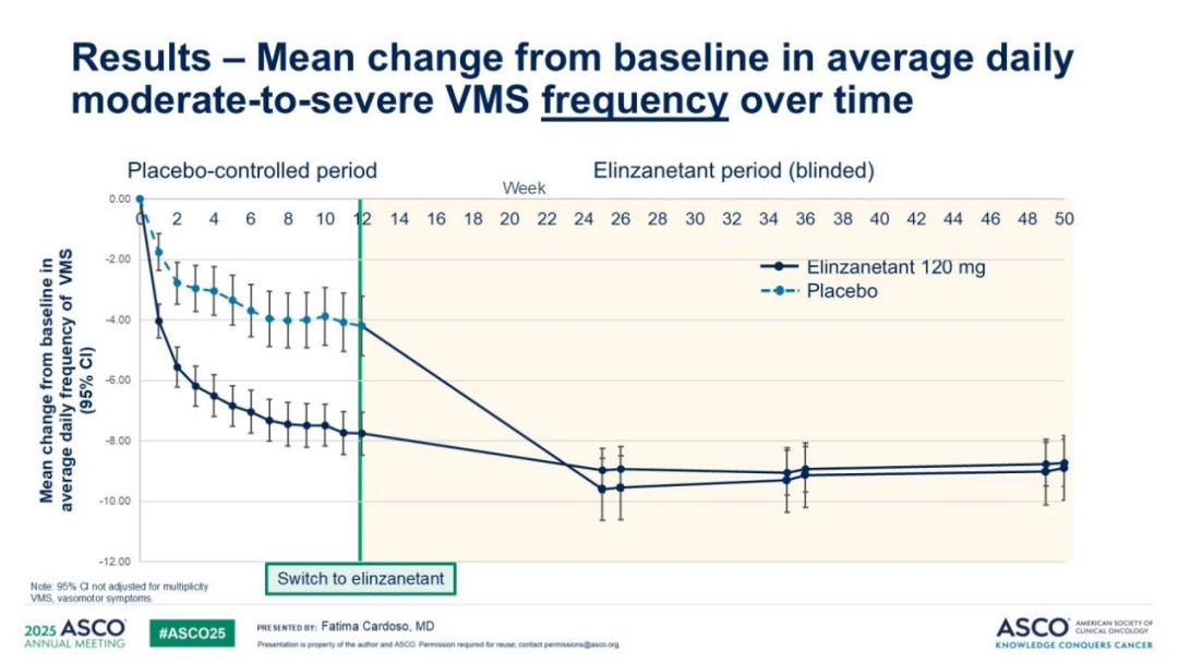 [3]、Fatima Cardoso,et al.Efficacy and safety of elinzanetant for vasomotor symptoms associated with adjuvant endocrine therapy:Phase 3 OASIS 4 trial.ASCO 2025.Abstract 508.