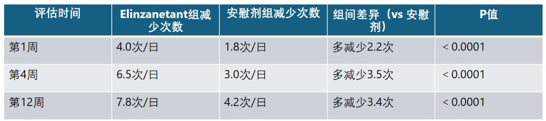 主要研究终点:基线时,Elinzanetant组和Placebo–Elinanetant组平均中重度血管舒缩症状为11.4 vs 11.5次。4周时,两组的中重度血管舒缩症状平均下降值为-6.51 vs-3.04次(P<0.001);12周时,下降值为-7.76 vs-4.20次(P<0.001)。
