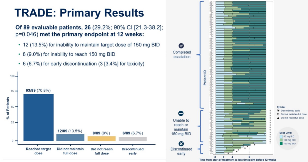 主要终点为12周时因任何原因停用阿贝西利或无法达到或维持150mg治疗的复合不良事件发生率,试验假设12周时复合不良事件发生率低于40%。剂量递增要求患者未出现持续性3/4级或持续性2级不良事件。