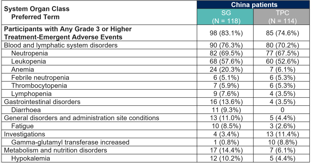 安全性方面,戈沙妥珠单抗在中国大陆人群的表现与全人群表现一致,以血液学毒性、腹泻为主,因治疗相关不良事件导致停药的比例为3.4%,未见治疗相关死亡事件,具有较好的耐受性和可控的安全性。
