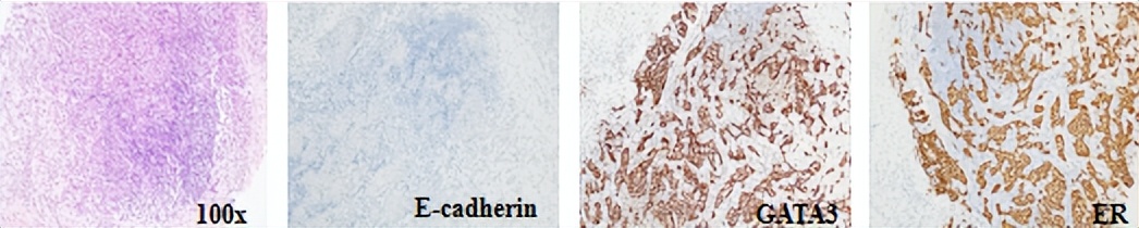 乳腺浸润性小叶癌。IHC:ER约95%强(+)、PR约1%中等(+)、Her-2(2+)、Ki67热点区约15%(+)、GATA-3(+)、CK5/6(-)、P120浆(+)、E-cadherin(-)。HER2 FISH(-)。
