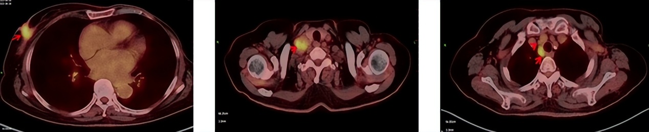 3.右腋下(1.0*0.5cm)及右侧锁骨上淋巴结(2.6*1.8cm),转移可能。