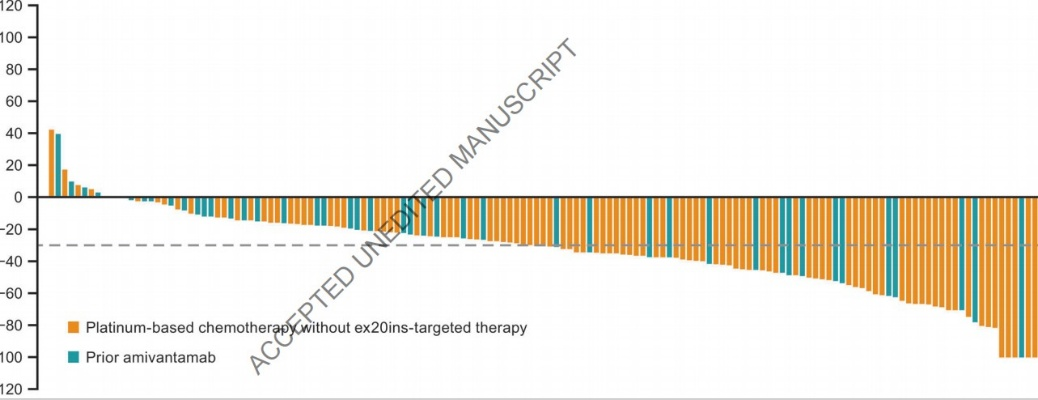 研究结果:最终,共计244例患者纳入本研究,并接受100 mg口服,每日两次的研究药物治疗。数据截止时,62.3%的患者永久性终止药物治疗,既往仅接受过含铂双药治疗和接受过靶向治疗患者分别有143例和101例患者,并分别有33.6%和54.5%的患者在入组时有脑转移,分别有95.1%和98%的患者至少有一个转移病灶既往接受过靶向药物治疗的患者中,埃万妥占比82.8%,莫泊替尼占比39.6%,奥希替尼占比6.9%,既往仅接受过含铂双药治疗的176例患者,ORR为35.2%,DCR为89.2%,临床获益率64.2%,中位DoR为8.8个月;既往接受过针对20外显子插入突变的患者,ORR为40%,DCR为88.8%,临床获益率68%,中位DoR为8.8个月;仅接受过埃万妥治疗的患者,ORR为30%,中位DoR为14.7个月,既往接受过埃万妥和其他靶向药物治疗的患者,ORR为14.3%,中位DoR为4.2个月。全组全因、任何级别不良反应发生率为99.2%,治疗相关不良反应发生率91.4%,3度以上治疗相关不良反应发生率为29.5%。贫血为最常见的治疗相关3度不良反应,发生率为7%,其他的包括肺炎和皮疹,发生率各2.5%,42.2%的患者因不良反应剂量降低,39%的患者治疗中断,8.2%的患者永久性终止治疗。