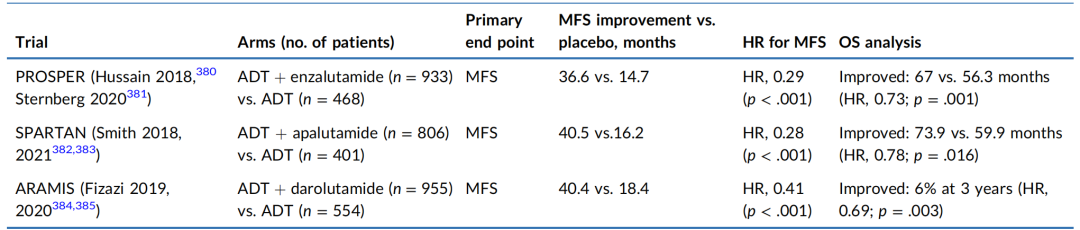 在mHSPC中,已有多项临床试验证明,ADT联合多西他赛或ARPI可显著改善总生存期。在高负荷同步转移患者中,多西他赛降低死亡风险的幅度最大。然而,这些Ⅲ期临床试验排除了体能状态差或合并症严重的患者,平均年龄小于真实世界情况。已知ARPI可能增加全因心血管事件,包括高血压、心律失常或心源性死亡。大多数Ⅲ期试验中的患者为新发转移性激素敏感性前列腺癌,在将这些数据外推至初始治疗后复发的患者时应谨慎。所有适合的患者都应接受ADT联合另一种药物的双药联合治疗;在条件允许的情况下,建议选择ARPI而非多西他赛。两项Ⅲ期试验证明,在ADT+多西他赛基础上加用ARPI可改善无转移生存期和总生存期,而ADT+ARPI+多西他赛的价值尚不明确。