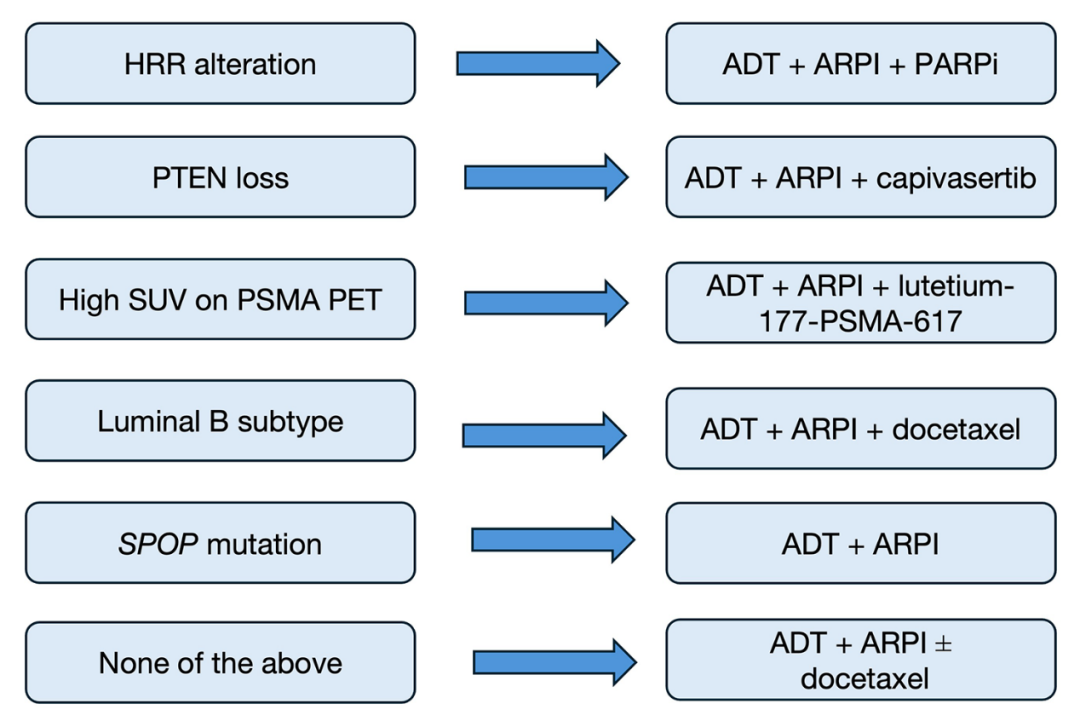 尽管这些临床特征提供了一些指导,但仍需要更多生物标志物来制定个体化治疗方案。正在进行的试验,例如TRIPLE-SWITCH(NCT06592924)和A-DREAM(NCT05241860),旨在通过探索生物标志物驱动的治疗策略来弥补这一差距。TRIPLE-SWITCH试验旨在评估在ADT联合ARPI治疗基础上添加多西他赛是否对PSA反应欠佳的患者有益,而A-DREAM试验则旨在研究在ARPI治疗基础上表现出良好疗效的患者是否可以安全地中断ADT。总而言之,这些研究反映出一种日益增长的趋势,即转向动态、根据疗效调整的治疗策略,以优化疗效并最大程度地减轻治疗负担。