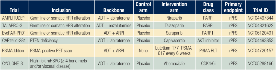 基于PARP抑制剂(PARPi)在mCRPC治疗中的成功经验,包括AMPLITUDE试验(NCT04497844)、TALAPRO-3试验(NCT04821622)和EvoPAR-PR01试验(NCT06120491)在内的多项研究,目前正在评估PARPi在mHSPC等早期疾病中的作用。AMPLITUDE试验是其中首个报告结果的试验,其在2025年ASCO年会上公布的数据显示,PARPi显著改善了放射学无进展生存期(rPFS)。总体生存数据和监管审查尚待确定;这将决定该疗法是否会成为新的治疗标准。此外,CAPItello-281试验(NCT04493853)正在评估AKT抑制剂ipatasertib对PTEN缺陷型mHSPC患者的疗效,该试验基于先前在mCRPC中发现的抗肿瘤活性证据。近期新闻稿宣布,该试验已达到其主要终点,即改善rPFS,但我们仍在等待完整数据的发布。同样,基于VISION和PSMAfore试验,Lu-177-PSMA-617已证明其对mCRPC有效,现已在PSMAAddition试验(NCT04720157)中接受评估。新闻稿称,在ADT联合ARPI治疗中添加Lu-177-PSMA-617可显著改善PSMA阳性mHSPC患者的rPFS。最后,正在进行的3期CYCLONE-3试验(NCT05288166)旨在评估abemaciclib联合阿比特龙治疗高危mHSPC患者的作用。尽管这些早期结果令人鼓舞,但在这些方法被纳入标准实践之前,正式公布数据并进行同行评审至关重要。