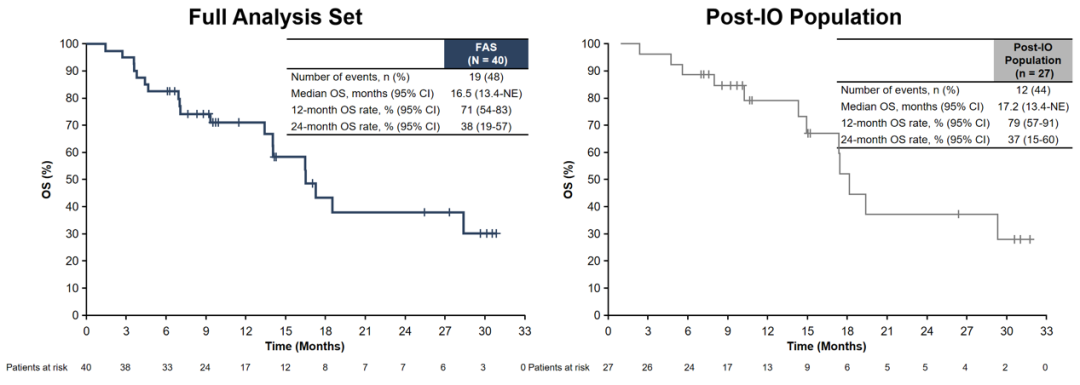 这是一项多中心、单臂、多队列、开放标签的II期临床试验,宫颈癌队列入组了40例对铂类及紫杉类耐药或不耐受的r/mCC患者(全体患者,FAS),其中27例(68%)既往接受过免疫治疗(Post-IO)。