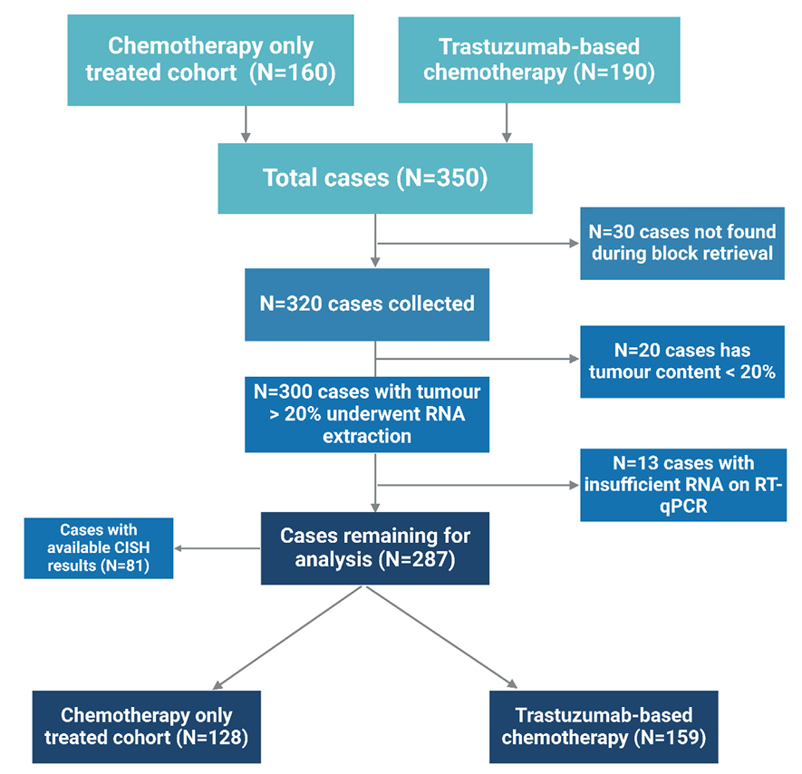 研究队列包含两种分子亚型:HER2+/管腔B亚型(HER2+、ER+、PR+/-),HER2+/非管腔亚型(HER2+、ER-和PR-)。最终纳入了287例具有福尔马林固定石蜡包埋样本和有效MammaTyper结果的病例进行分析。