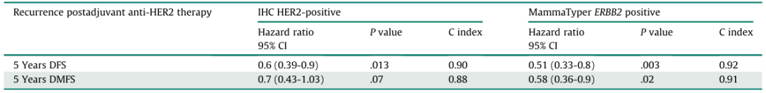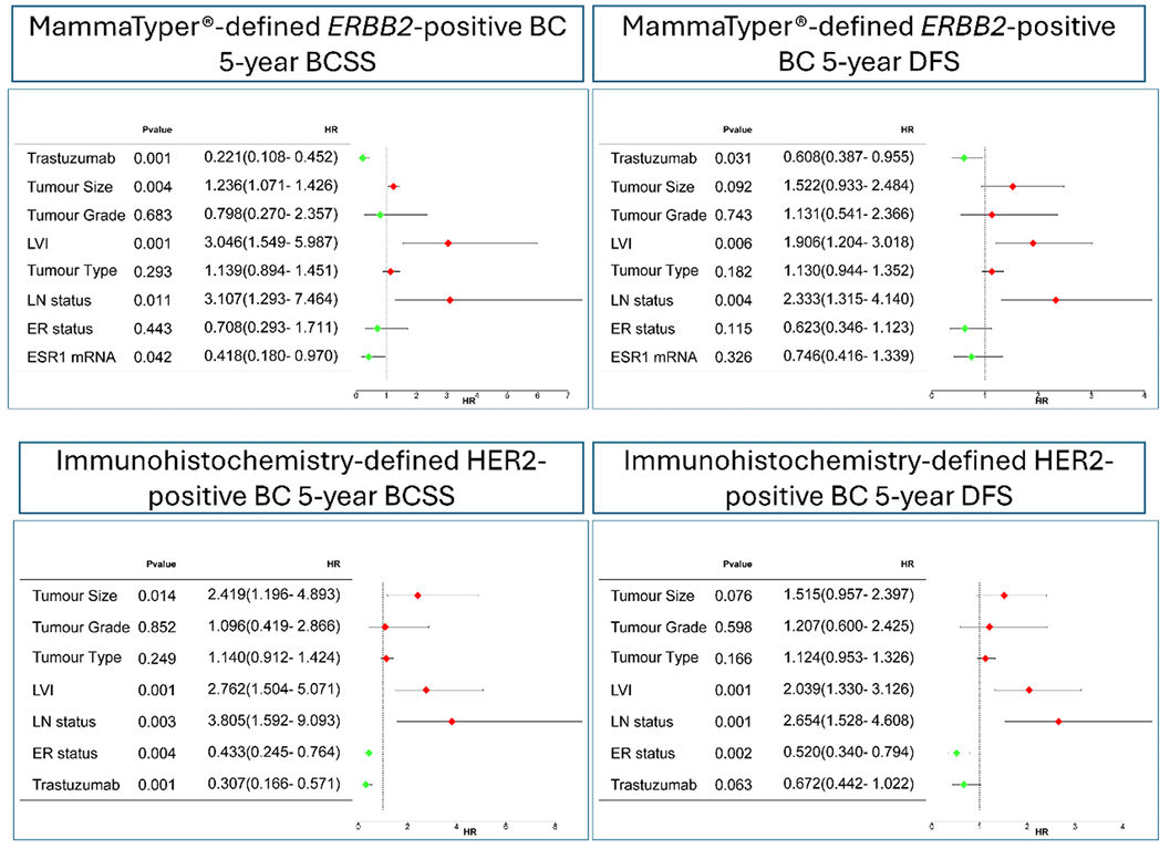 在多变量Cox回归模型中,当根据肿瘤分级、肿瘤大小、淋巴结转移、淋巴管侵犯、组织学肿瘤类型和ER状态调整MammaTyper定义的ERBB2+亚组(251名患者)时,抗HER2治疗是延长5年DFS(HR:0.61,95%CI:0.38-0.96;P=0.031)和5年BCSS(HR:0.21,95%CI:0.18-0.45;P<0.001)的独立预测因子。尽管在IHC定义的HER2+(287名患者)中,抗HER2疗法是更好的BCSS的独立预测因素(HR:0.31,95%CI:0.16-0.57;P<0.001),但不是5年DFS的独立预测因素(HR:0.67,95%CI:0.44-1.02;P=0.063)。