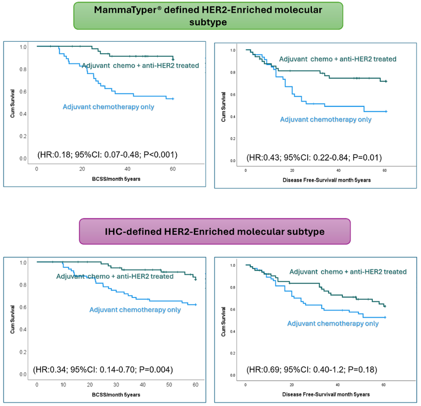 这项研究旨在评估基于mRNA的多基因检测在预测HER2+乳腺癌患者的抗HER2治疗的疗效作用,并对比了MammaTyper分类和传统IHC分类的差异。研究结果表明,MammaTyper检测可以客观且准确地评估HER2状态,对治疗结果具有重要意义。未来的研究需要进一步改进这些技术,并在更大、更多样化的队列中验证其临床实用性。