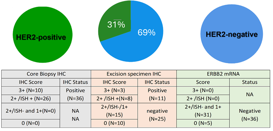 就MammaTyper检测定义的ERBB2-而言,70%(26/36)为HER2 IHC 2+/ISH+,HER2基因拷贝数中位数为6.5。