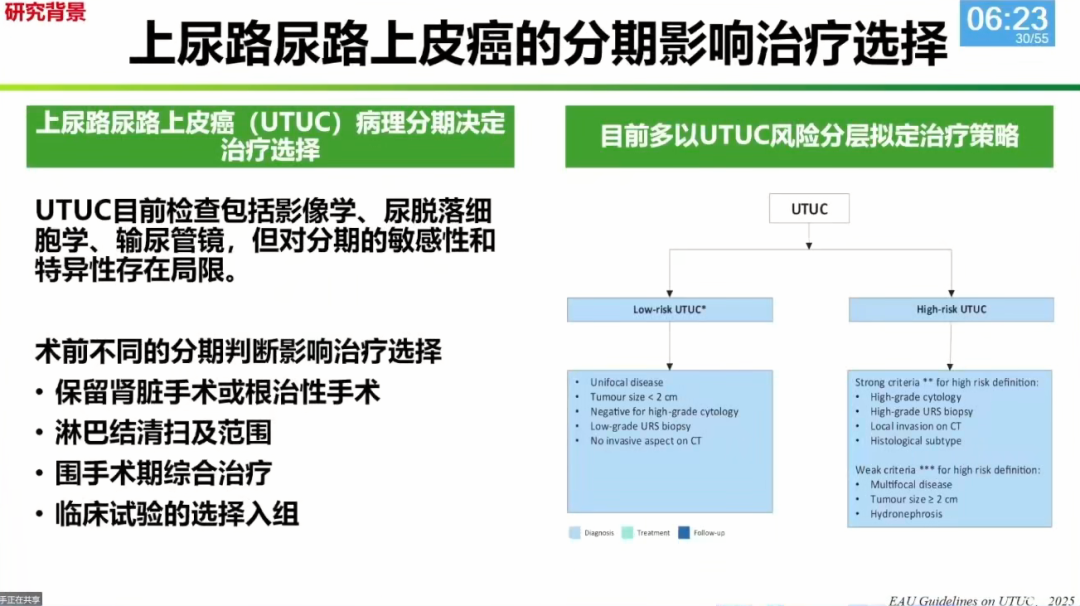 对于局部晚期的上尿路尿路上皮癌(UTUC),POUT研究奠定了辅助化疗的地位。但中肿团队思考的是,能否将治疗时机“前移”至新辅助阶段,以获得更大获益。实现这一目标的关键在于术前精准分期。团队通过多中心合作,利用影像组学与深度学习技术,将UTUC的术前分期准确率提升至87%,为新辅助治疗的精准筛选奠定了基础。
