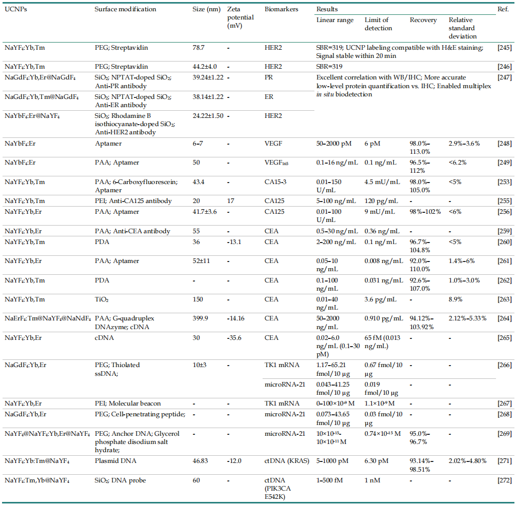 表2.UCNPs在乳腺癌肿瘤标志物检测中的应用。