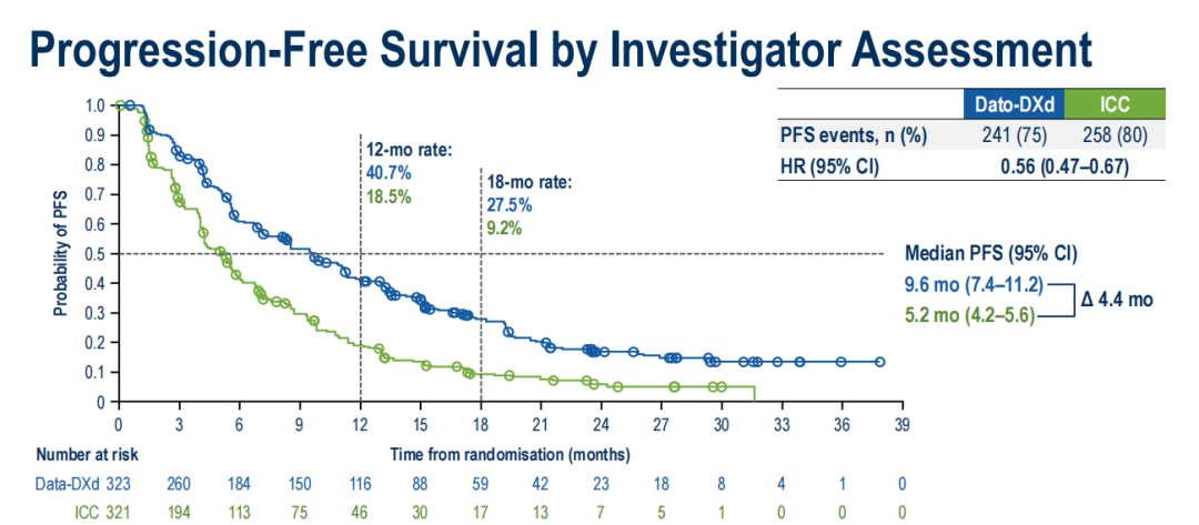 Dato-DXd组由BICR评估的中位PFS为10.8个月(95%CI:8.6-13.0),而ICC组为5.6个月(95%CI:5.0-7.0),Dato-DXd相较于化疗使患者中位PFS延长5.3个月,疾病进展或复发风险降低43%,HR 0.57(95%CI:0.47-0.69);P<0.0001。研究者评估的PFS与BICR评估的PFS一致。