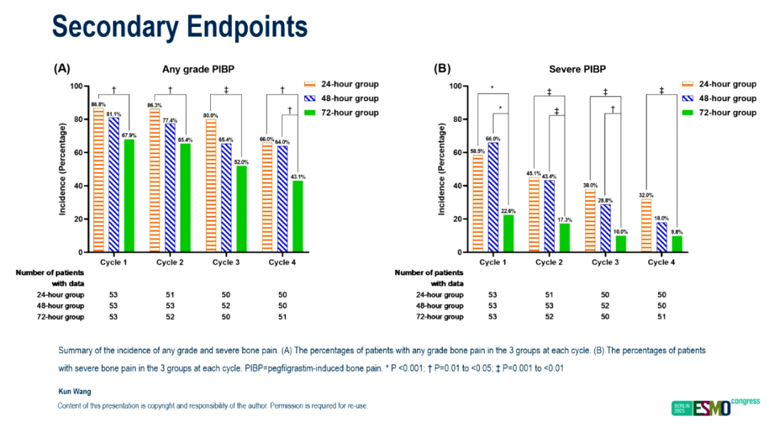 王坤教授:在该研究中我们入组的是1-3期的乳腺癌患者,这些患者有中高危的出现中性粒细胞下降的风险,他们按照1∶1∶1比例随机进入了24、48和72组。主要终点是首个化疗周期中连续五天每日最严重骨痛评分(0-10数字评分法)的曲线下面积。次要终点包括严重骨痛(NRS评分>5分)的发生率和持续时间,以及中性粒细胞减少症和发热性中性粒细胞减少症的发生率。