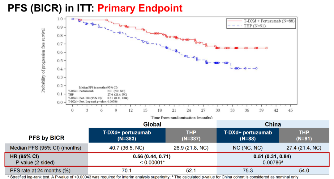 DB-09研究无疑是又一座具有划时代意义的里程碑。作为首个直接挑战传统THP一线标准疗法、将T-DXd用于HER2阳性晚期乳腺癌一线治疗的Ⅲ期多中心临床试验,其在今年ASCO大会上揭晓了总人群数据[4]:相较于THP方案,采用T-DXd联合方案可使BICR评估的mPFS从26.9个月大幅提升至40.7个月,疾病进展或死亡风险显著降低达44%(HR 0.56,P<0.00001,图2),且各亚组获益趋势一致。两组ORR为85.1%vs 78.6%,完全缓解率(CR)为15.1%vs 8.5%。此后,在CSCO大会上进一步披露的中国人群数据显示[5],T-DXd+P方案相较于THP,BICR评估的mPFS尚未达到终点,而对照组为27.4个月;疾病进展或死亡风险降低了49%(HR 0.51,P=0.00786,图3),其改善幅度较全球整体人群(HR=0.56)展现出更优的趋势。