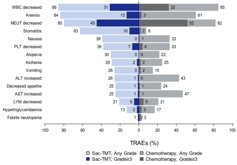 结果显示,sac-TMT较ICC显著延长了mPFS,为8.3个月vs.4.1个月(HR 0.35;95%CI,0.26-0.48;P<0.0001)。OS虽尚不成熟,但sac-TMT较ICC降低了63%的死亡风险(HR 0.33;95%CI,0.18-0.61)。同时,sac-TMT组ORR达到41.5%,ICC组为24.1%,取得了更好的缓解效果。