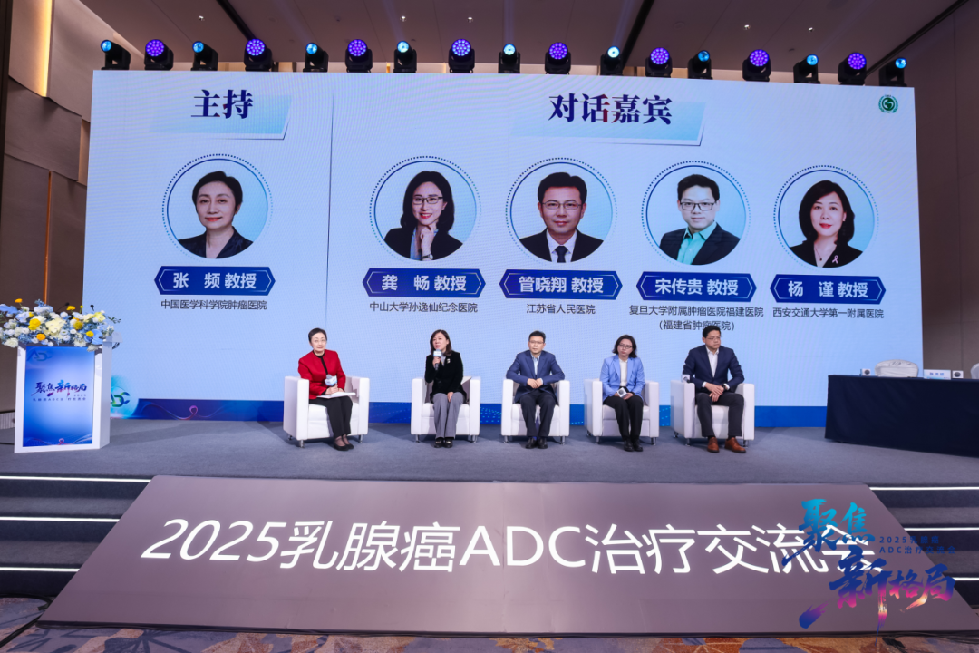随后的“高端对话”环节,中国医学科学院肿瘤医院张频教授、中山大学孙逸仙纪念医院龚畅教授、江苏省人民医院管晓翔教授、福建省肿瘤医院宋传贵教授、西安交通大学第一附属医院杨谨教授围绕“ADC未来研发方向与TROP2 ADC药物的治疗进展”展开深入讨论。专家一致认为,ADC药物正从HER2阳性向更广泛乳腺癌亚型拓展。随着更多新型靶点的涌现及新型细胞毒性载荷的不断引入,ADC的研发格局持续扩大,多个新靶点药物已在探索中,有望为包括乳腺癌在内的实体瘤患者提供更多治疗选择。从技术演进角度看,ADC药物的迭代方向日益明确,主要体现在三大方面:免疫原性进一步降低、药物释放稳定性不断提高,以及载荷毒性显著增强。