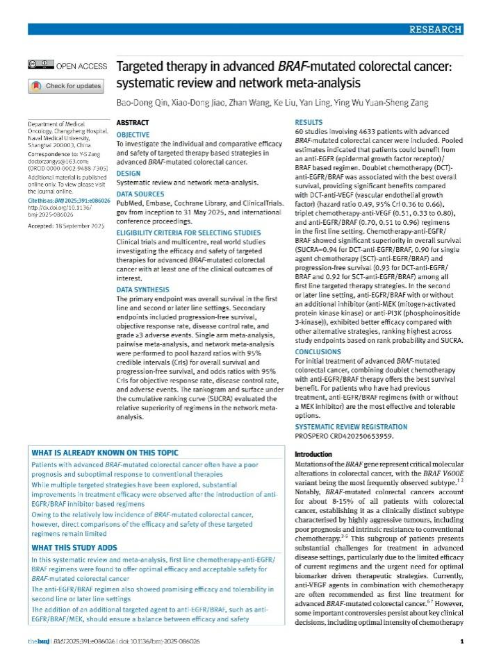 2025年11月18日,国际四大顶级医学期刊之一的《英国医学杂志》(British Medical Journal,The BMJ),以“Targeted therapy in advanced BRAF-mutated colorectal cancer:systematic review and network meta-analysis(晚期BRAF突变结直肠癌的靶向治疗:系统综述和网状meta分析)”为题,在线发表了海军军医大学第二附属医院(上海长征医院)肿瘤科臧远胜、秦保东教授团队最新研究论著(RESEARCH)。该研究对治疗BRAF突变型肠癌的治疗方案进行了全面、深入的研究,为该类患者的疗效突破提供了原创“长征方案”的关键证据。
