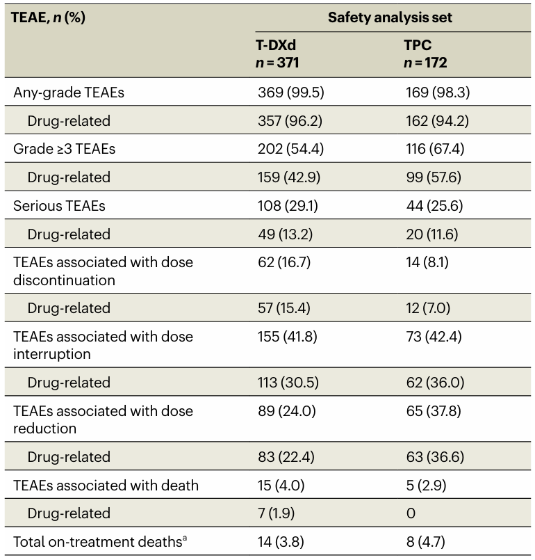 T-DXd的安全性与主要分析结果一致。至更新数据截止日期,T-DXd组的中位治疗持续时间为8.2个月(vs.TPC组为3.5个月)。两组任何级别的治疗期间不良事件(TEAE)发生率相似(T-DXd组为99.5%vs.TPC组为98.3%)。T-DXd组有202例患者(54.4%)发生≥3级TEAE,TPC组为116例患者(67.4%)。T-DXd组和TPC组分别有62例(16.7%)和14例(8.1%)患者因治疗期间出现的不良事件而停止治疗。