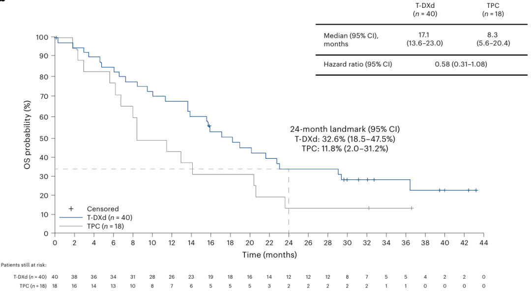 在总人群中,研究者评估的中位PFS在T-DXd组为8.8个月(vs.TPC组4.2个月;HR 0.36,95%CI 0.29-0.45)。T-DXd组24个月PFS率为14.5%。在HR+队列中,T-DXd组的研究者评估中位PFS为9.6个月(vs.TPC组4.2个月;HR 0.37,95%CI 0.30-0.46)。在HR-队列中,研究者评估的中位PFS在T-DXd组为6.3个月(vs.TPC组2.9个月;HR 0.29;95%CI 0.15–0.57)。
