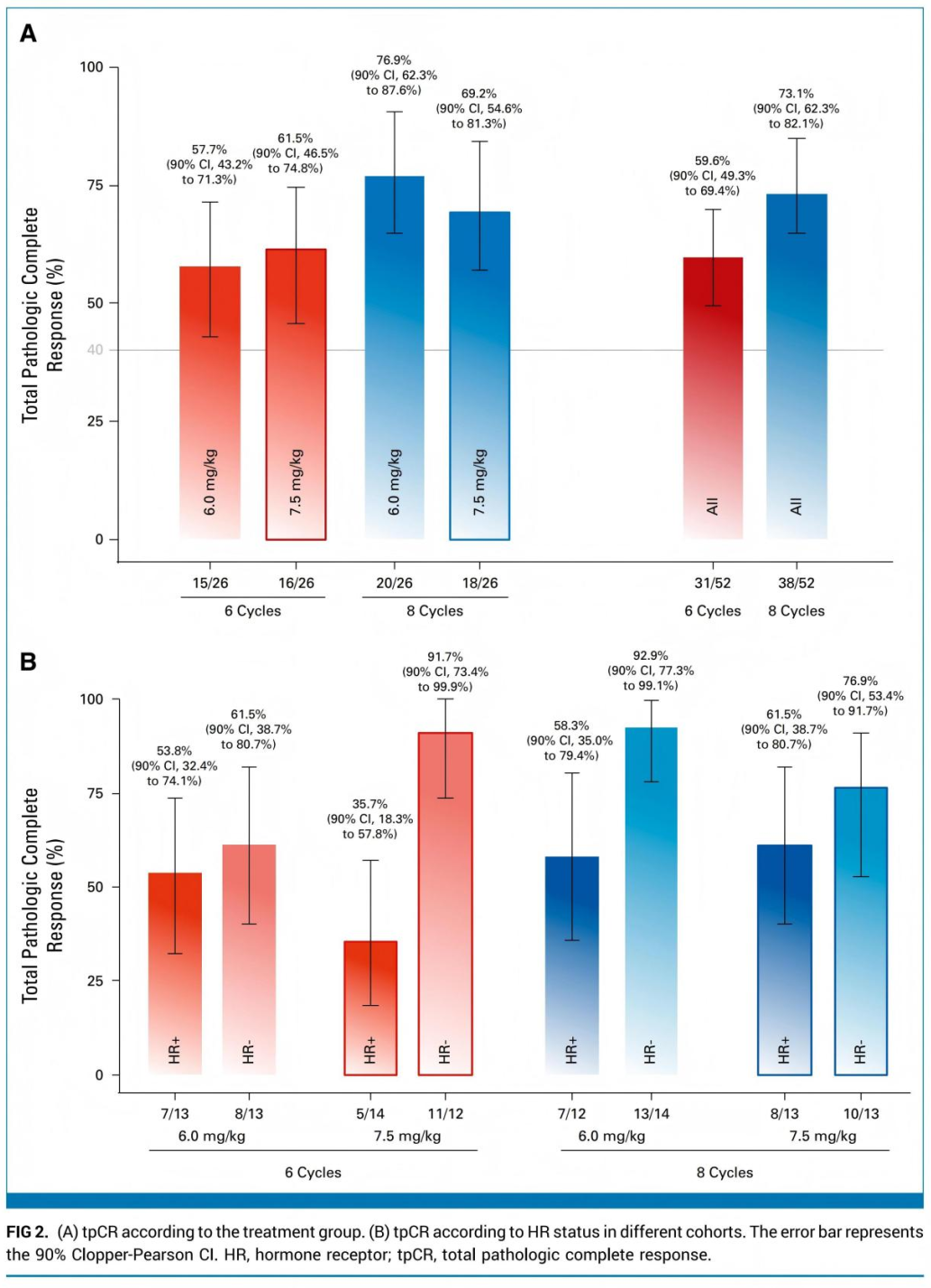 TQB2102-Ⅱ-01研究是一项在中国5家中心开展的开放标签、随机、Ⅱ期临床试验,旨在评估TQB2102在HER2阳性乳腺癌新辅助治疗阶段的抗肿瘤活性与安全性。研究纳入18至75岁、既往未接受过化疗的、经病理确诊为HER2阳性乳腺癌(免疫组化3+,或2+并经原位杂交证实扩增)患者。首先以1:1比例分配至6.0 mg/kg剂量治疗六周期(队列1)或八周期(队列2)的两组;在完成首阶段入组后,后续入组患者再按1:1比例分配至7.5 mg/kg剂量治疗六周期(队列3)或八周期(队列4)的两组。激素受体(HR)状态(阳性或阴性)作为唯一分层因素用于确保随机平衡。各组患者均按照方案接受TQB2102静脉给药,治疗持续至疾病进展、出现无法耐受的毒性、研究者判定不宜继续或患者主动退出。研究的主要终点为总病理完全缓解率(tpCR),定义为术后乳腺原发灶及区域淋巴结均无浸润性残余病变的比例;次要终点包括乳腺病灶的病理完全缓解率(bPCR)、ORR、无事件生存期(EFS)、无侵袭性疾病生存期(iDFS)、总生存期(OS)以及安全性。