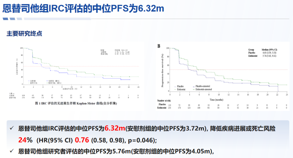 △恩替司他联合依西美坦与安慰剂联合依西美坦的PFS结果