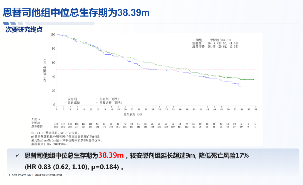 恩替司他联合依西美坦的mOS达到38.39个月,较依西美坦联合安慰剂绝对值延长超过9个月,降低死亡风险17%(HR 0.83,95%CI:0.62~1.10,P=0.184)[7]。此项研究是HR+晚期乳腺癌领域难得具有成熟OS结果的临床研究,有效延续了患者生命的长度,契合了当前国内外指南“延长患者生存”的根本追求。
