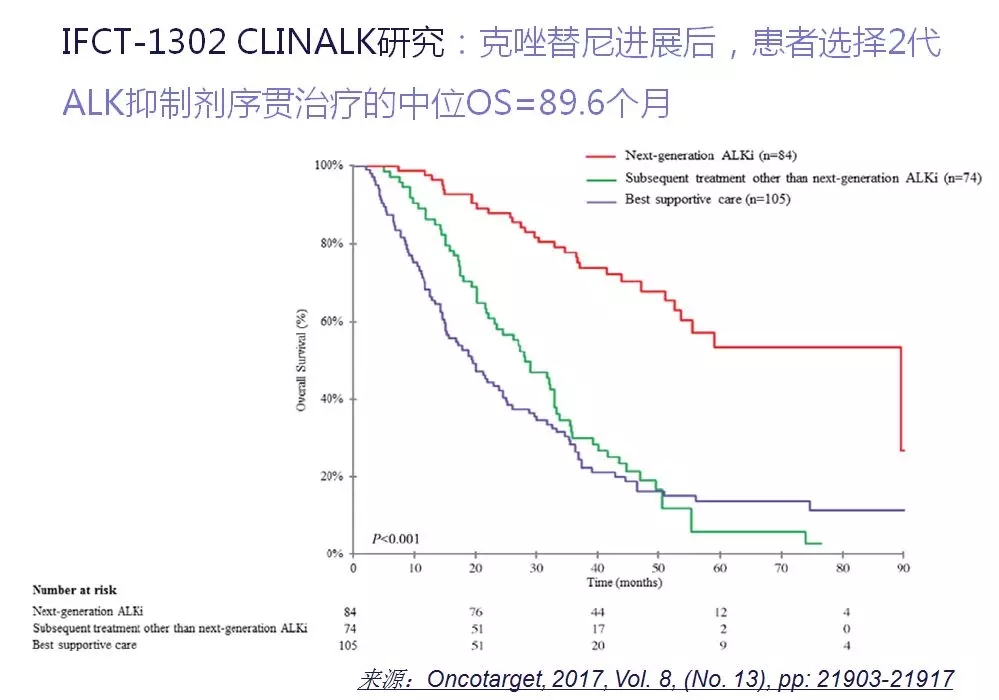 一项法国真实世界数据显示,起始克唑替尼治疗后的中位OS为16.6个月。为了分析克唑替尼治疗进展后不同治疗策略的作用,研究者将患者分为3组:只接受最佳支持治疗(BSC,105例)、二代ALK抑制剂以外的药物(74例)、二代ALK抑制剂(84例)。结果显示二代ALK抑制剂治疗组中75%的患者首选了塞瑞替尼。在接受二代ALK抑制剂的患者中,中位OS达到惊人的89.6个月,显著长于使用二代ALK抑制剂以外的药物(28.2个月)和BSC(19.6个月)(P<0.001)。这些来源于真实世界的病例数据,提示我们在克唑替尼进展的后线治疗选择中,塞瑞替尼等2代ALK抑制剂的序贯治疗可以为患者带来长期的生存获益。