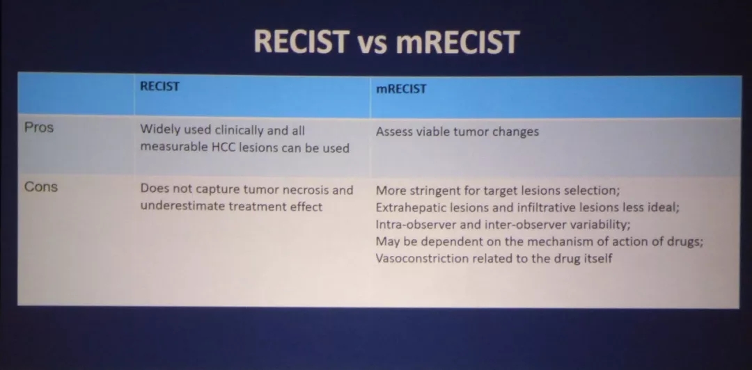 此外Llovet将布拉尼布用作二线治疗的III期临床试验研究、Edeline等人对索拉菲尼和Meyer对尼达尼布的研究结果均支持mRECIST标准评价疗效可以有效的预测生存期这一结论,然而Bruix在瑞戈非尼治疗使用索拉非尼后进展的肝细胞肝癌的III期RESOURCE研究中却提出相佐意见。存在争议的主要原因是药物作用机理的不同影响mRECIST标准的评估,2017-2018年间大量研究显示运用RECIST 和mRECIST标准评价仑伐替尼与索拉菲尼(TKI代表药物)的ORR分别18.8% vs 40.6%与4.4% vs 15.6%,而纳武单抗与帕姆单抗(免疫抑制剂)的ORR分别为14% vs 19%与17% vs 15%,药物作用机制的不同将影响ORR的评判,从而不能准确预测生存期。