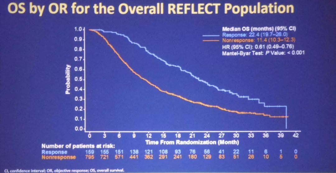2018年发表在Lancet上的一项回顾性REFLECT研究,系全球范围内的随机、开放III期非劣性研究,该研究共入组954例不可切除的肝细胞肝癌患者,分别接受索拉菲尼和仑伐替尼治疗,总中位生存期为13个月(仑伐替尼和索拉菲尼的中位生存期分别为13.6个月和12.3个月),基于mRECIST标准评估客观缓解率(ORR)结果显示总ORR为16.7%(仑伐替尼和索拉菲尼的ORR分别为24.1%和9.2%),进一步研究发现治疗有效组的中位生存期为22.4个月明显优于治疗无效组的11.4个月,提示mRECIST标准评估客观缓解率可以有效预测生存期。