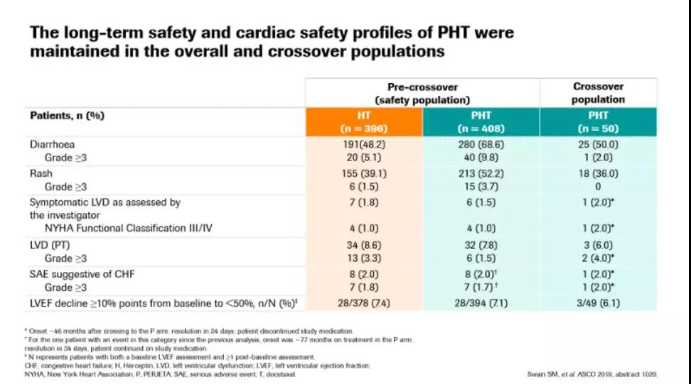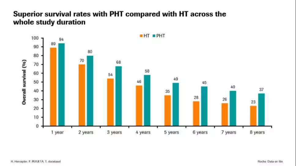 此次我在2019ASCO大会上报告这项研究的最终生存分析数据(截止至2018年11月的生存数据),并确定患者OS结果。随访8年的里程碑式分析显示:接受帕妥珠单抗+曲妥珠单抗“双靶治疗”患者仍有37%的存活,而接受曲妥珠单抗治疗的患者仅有23%存活。这表明OS率至少有14%的改善,中位OS大约有16个月的改善,所以这一点得到了支持。这对患者来说是非常令人兴奋的,因为在过去,他们除了曲妥珠单抗治疗以外不会有更好的生存获益,从而面临死亡的威胁。因此,帕妥珠单抗+曲妥珠单抗“双靶治疗”确实改变了这些患者的轨迹和结果,部分患者甚至可能实现治愈,并且极大地改善了他们的生活。